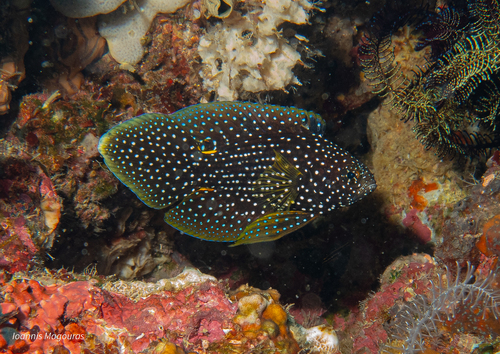 Svart med vita prickar och ögonfläck som imiterar en muräna. Fascinerande försvarsbeteende.